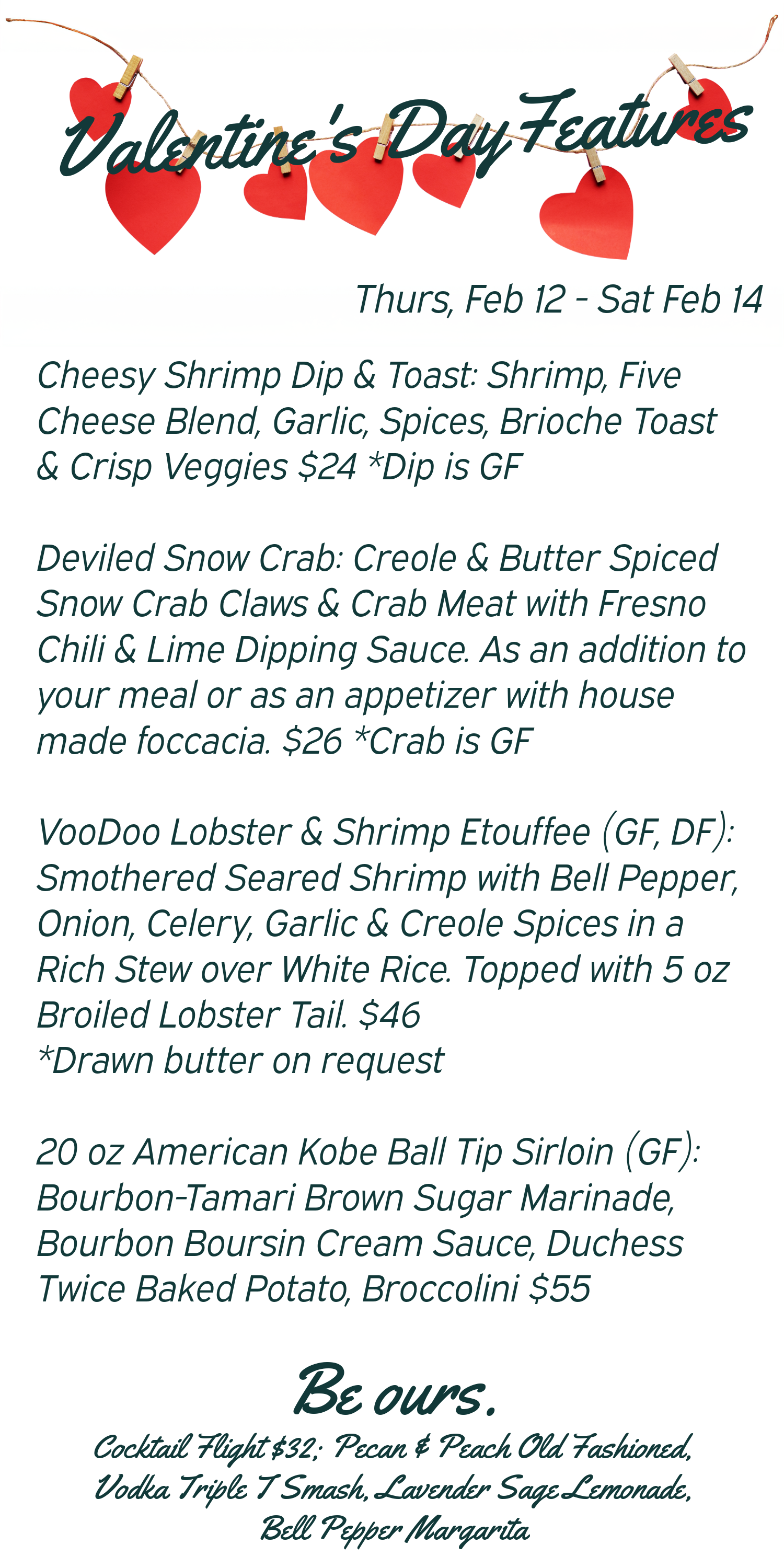 Join the 1B crew this year on Valentine’s Weekend! We’re running a special menu Thursday, Feb 12 through Saturday, Feb 14. Since Valentine’s is a weekend date, we suggest making reservations as soon as you’re able.