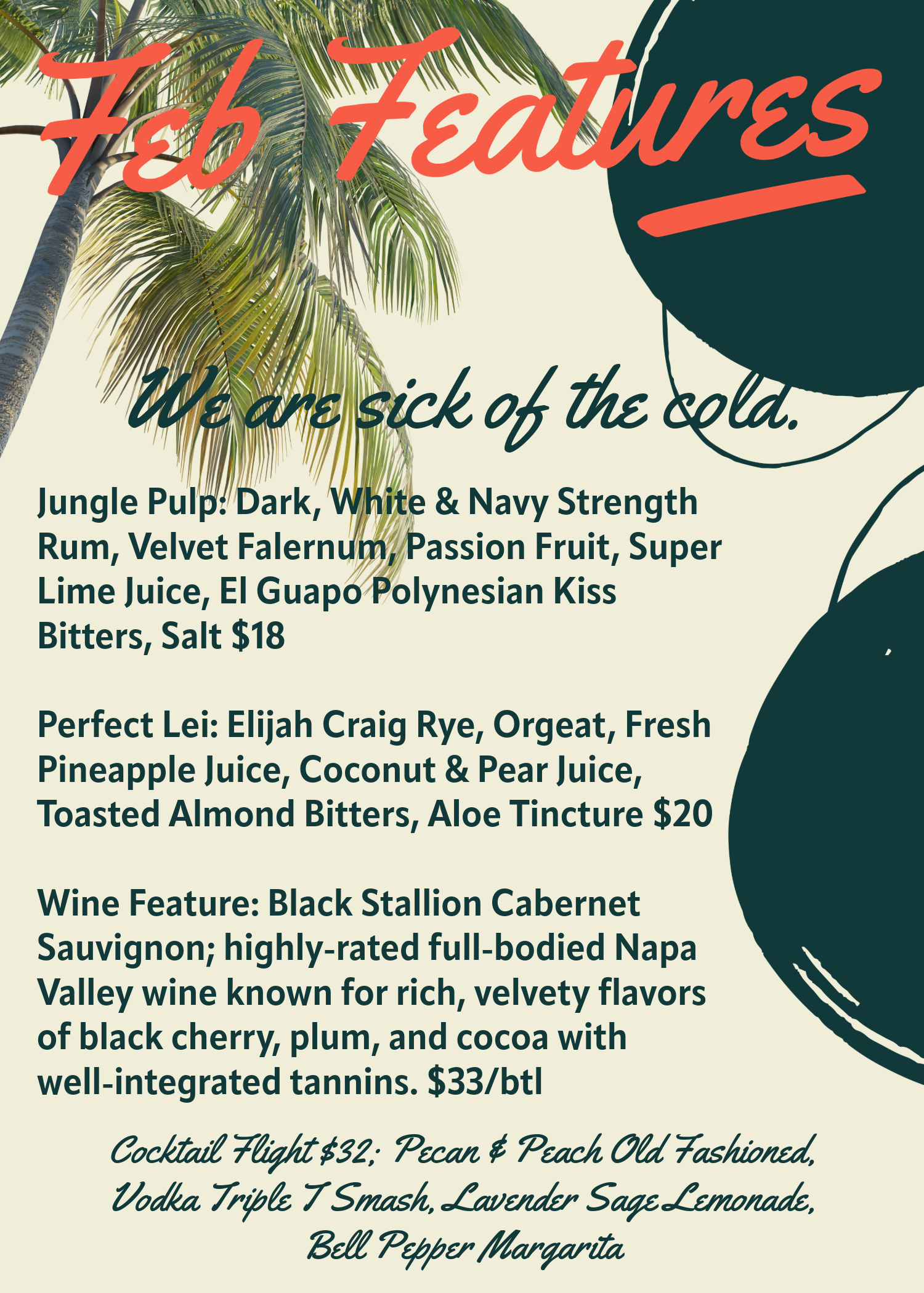 We are sick of the cold! This month, we used thoughts of glorious vacations for our food & cocktail creations. Enjoy the bit of sunshine!