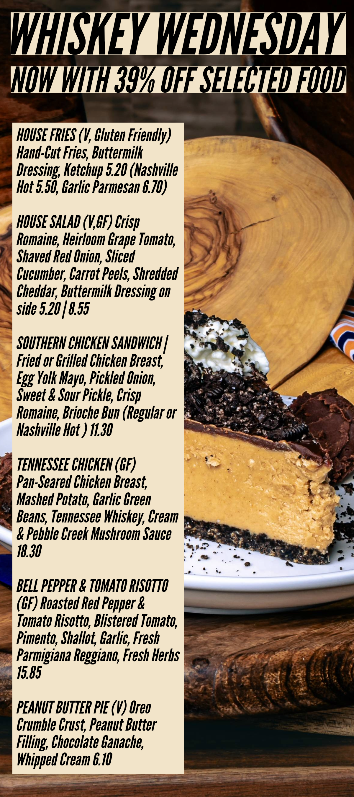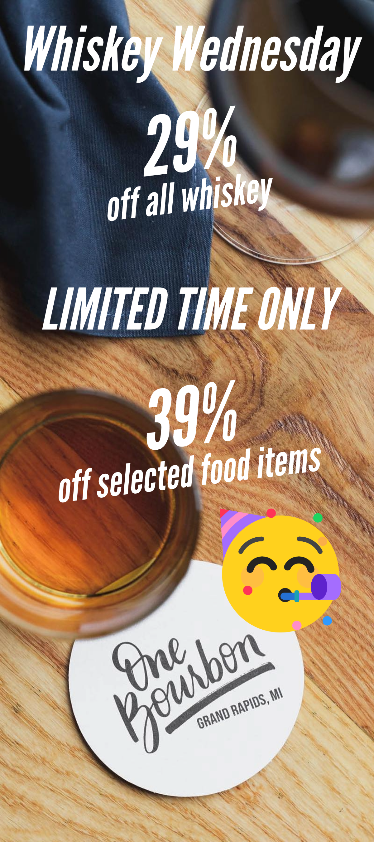 For a few short weeks, we hope you enjoy 29% off ALL WHISKEY and 39% off selected FOOD ITEMS.